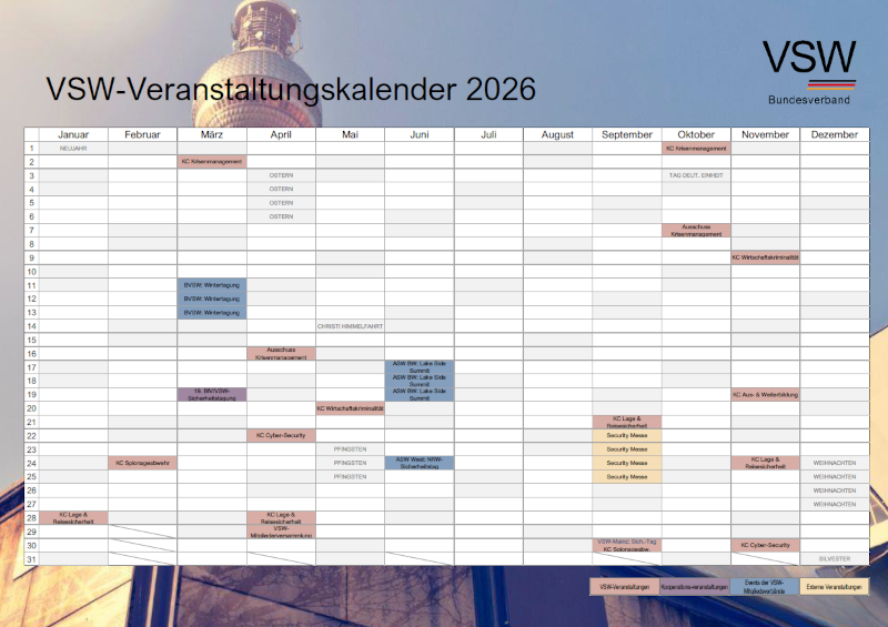 Der VSW-Bundesverband bietet seinen Mitgliedern aber auch Interessierten eine umfangreiche Palette an Veranstaltungen und Austauschrunden. Von der jährlichen BfV/VSW-Sicherheitstagung, über die Kompetenz-Center-Sitzungen bis hin zu exklusiven Veranstaltungen für die Fördermitglieder, wie den Lage-Call, den Ausschuss Krisenmanagement und den Jahresempfang. Um sich über das Thema Wirtschaftsschutz zu informieren und mit anderen Unternehmen auszutauschen, ist für jeden etwas dabei. Auch Regional- und Landesverbände führen spannende Events durch, die ebenfalls im VSW-Veranstaltungskalender zu finden sind.